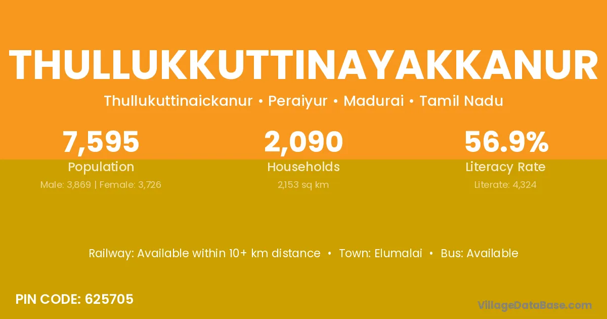 Thullukkuttinayakkanur village has a total population of 7,595 people, of which 3,869 are males and 3,726 are females.