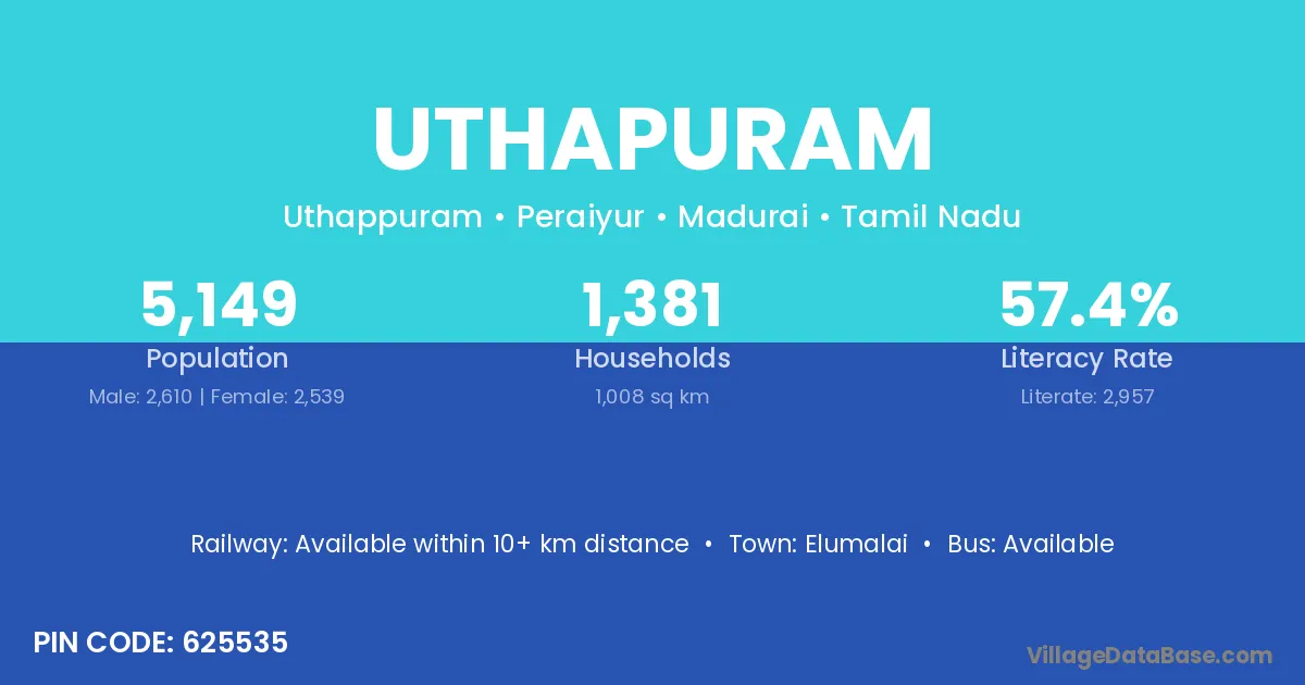 Uthapuram village has a total population of 5,149 people, of which 2,610 are males and 2,539 are females.