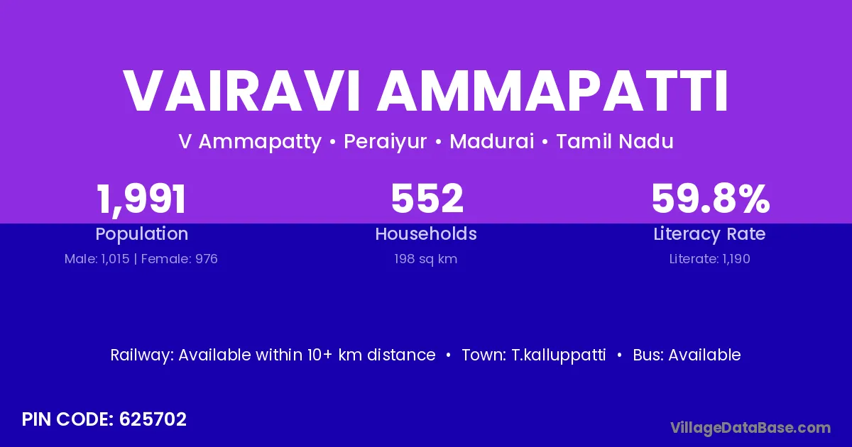 Vairavi Ammapatti village has a total population of 1,991 people, of which 1,015 are males and 976 are females.
