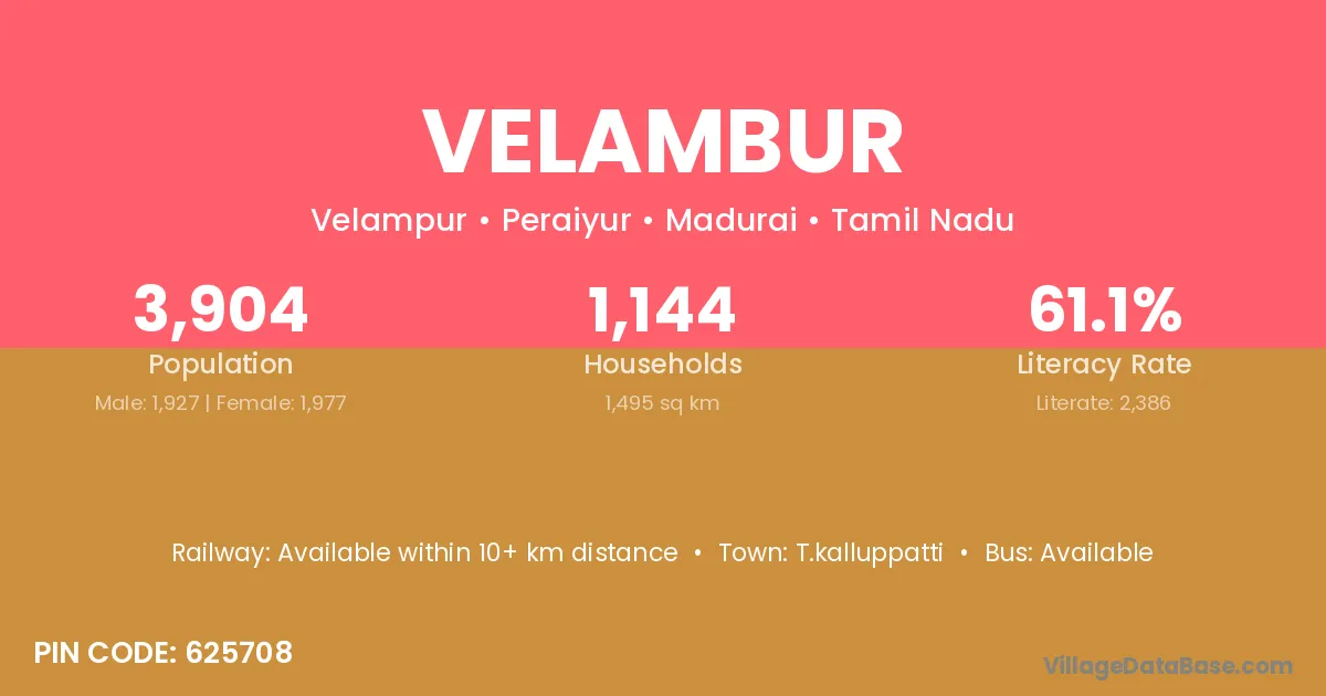 Velambur village has a total population of 3,904 people, of which 1,927 are males and 1,977 are females.