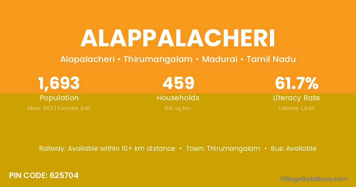 Alappalacheri village has a total population of 1,693 people, of which 853 are males and 840 are females.
