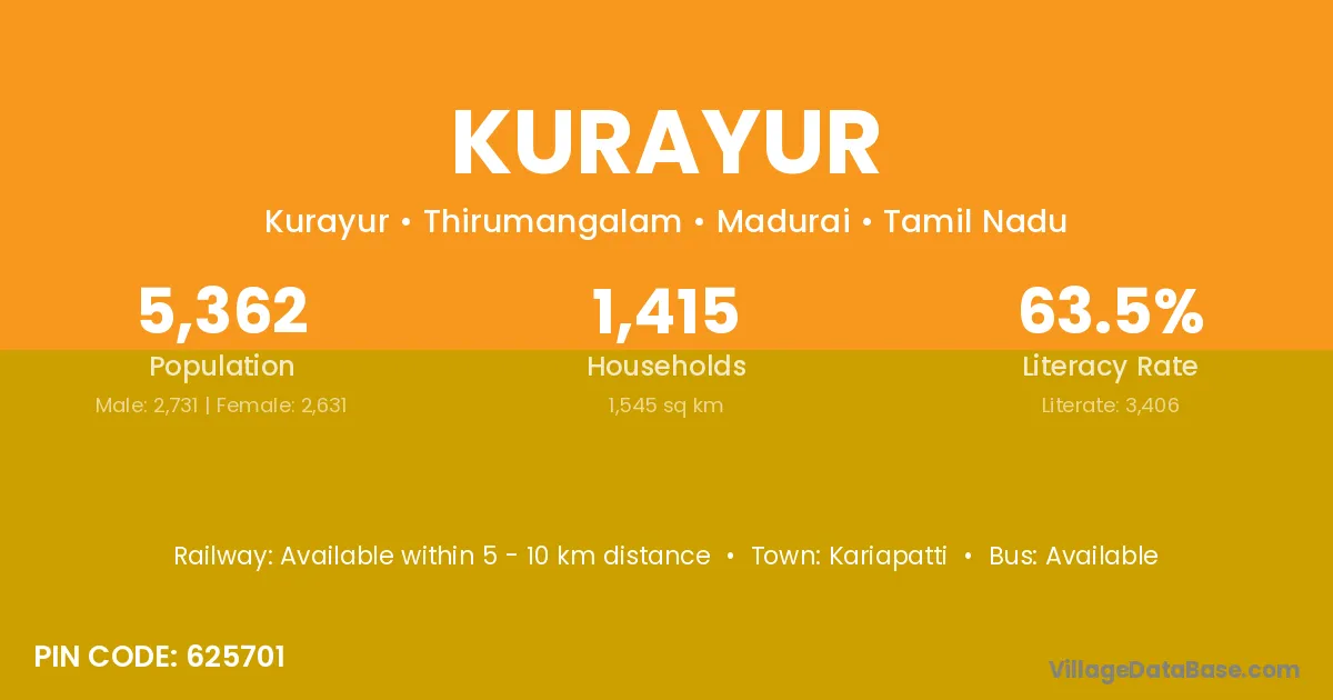 Kurayur village has a total population of 5,362 people, of which 2,731 are males and 2,631 are females.