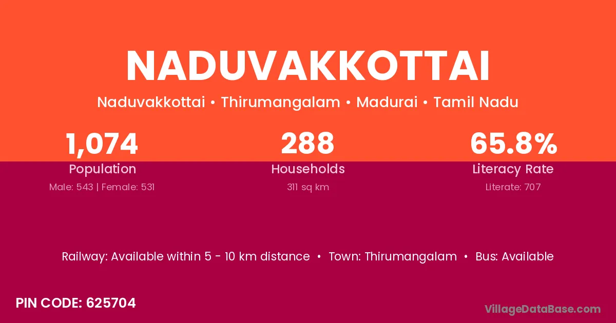 Naduvakkottai village has a total population of 1,074 people, of which 543 are males and 531 are females.