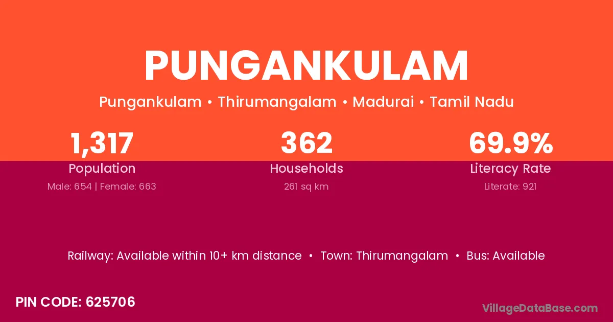 Pungankulam village has a total population of 1,317 people, of which 654 are males and 663 are females.