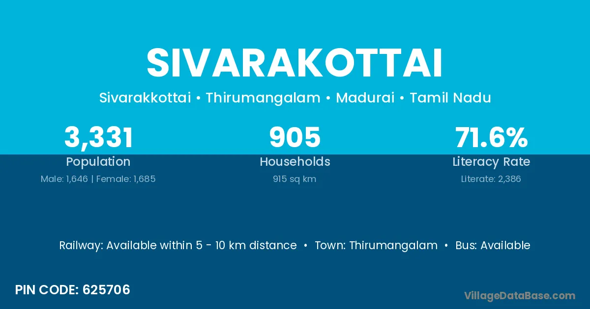 Sivarakottai village has a total population of 3,331 people, of which 1,646 are males and 1,685 are females.