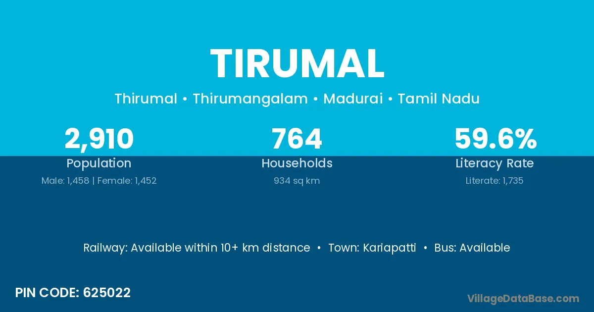 According to Census 2011 information, the village code of Tirumal village is 625022.