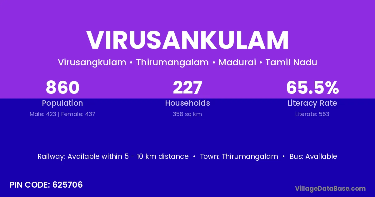 Virusankulam village has a total population of 860 people, of which 423 are males and 437 are females.