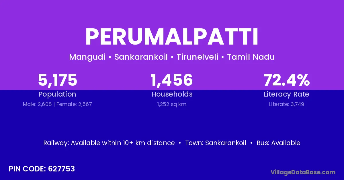 The literacy rate of Perumalpatti village is 56.82%. Male literacy stands at 65.82% and female literacy at 48.43%.