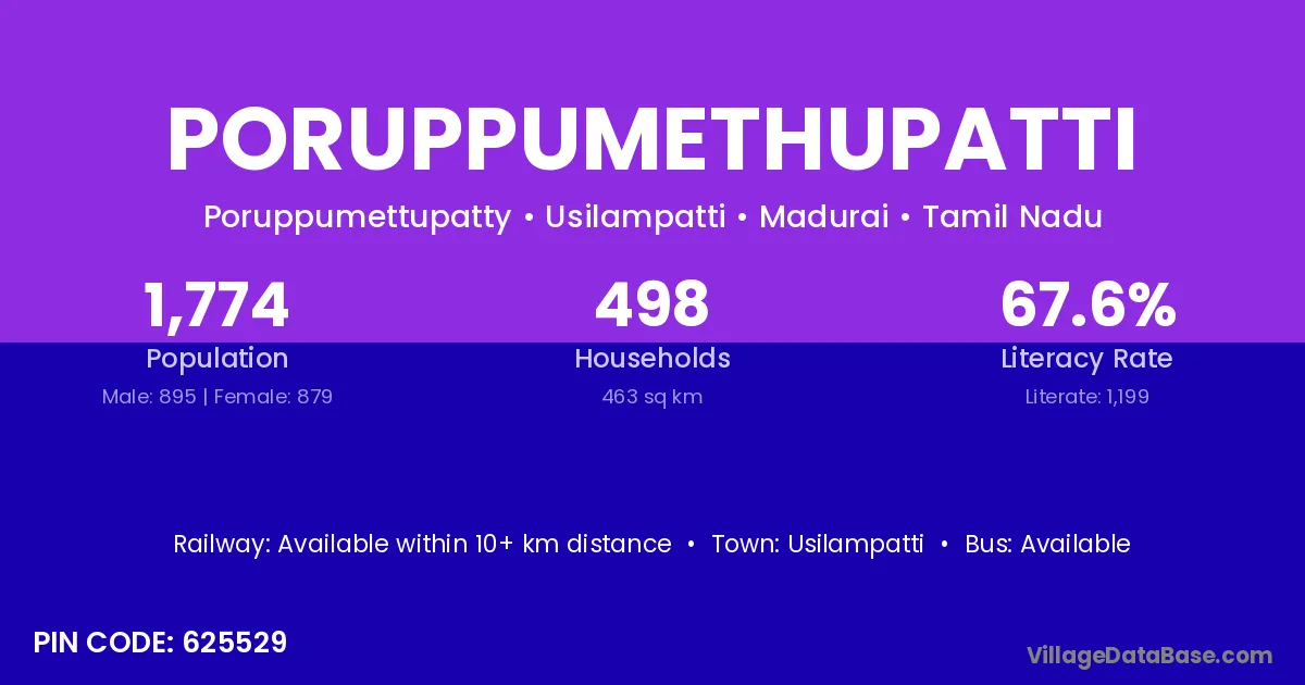 Poruppumethupatti village has a total population of 1,774 people, of which 895 are males and 879 are females.