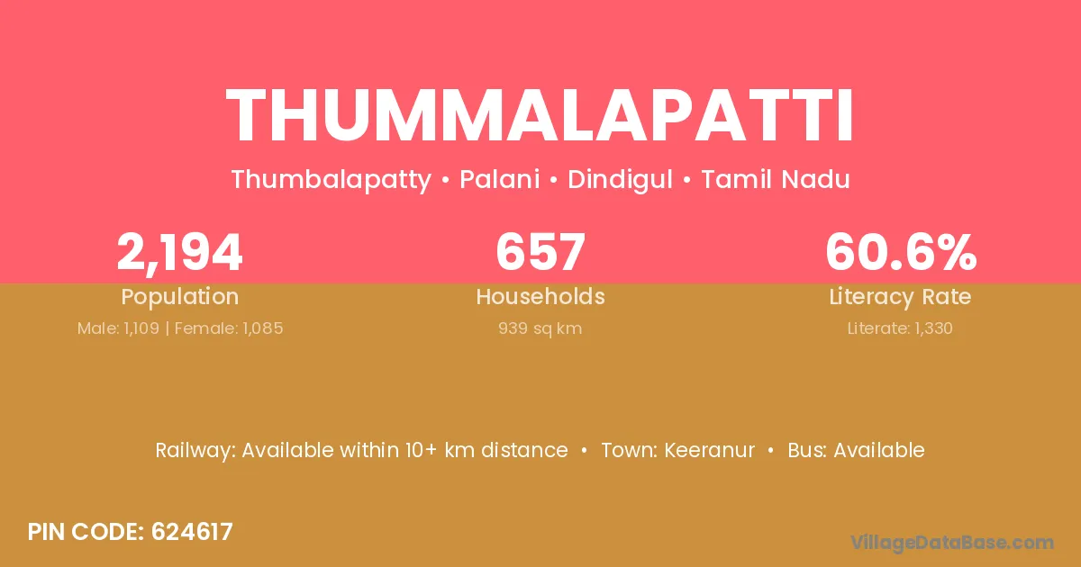 The literacy rate of Thummalapatti village is 73.62%. Male literacy stands at 82.48% and female literacy at 63.91%.