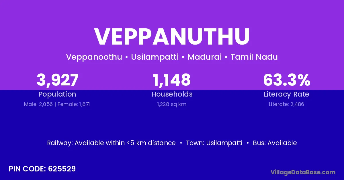 Veppanuthu village has a total population of 3,927 people, of which 2,056 are males and 1,871 are females.