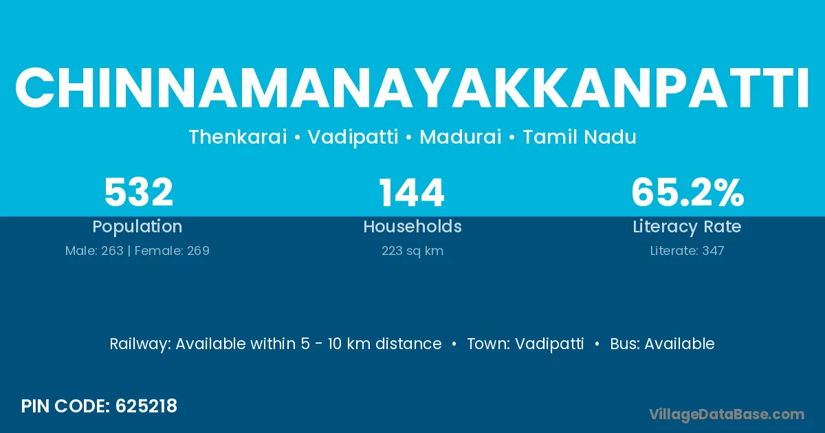 Chinnamanayakkanpatti village has a total population of 532 people, of which 263 are males and 269 are females.