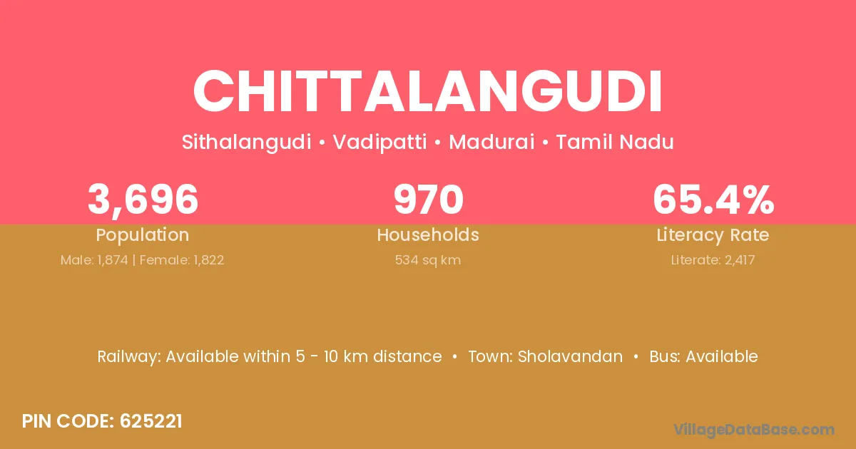 Chittalangudi village has a total population of 3,696 people, of which 1,874 are males and 1,822 are females.