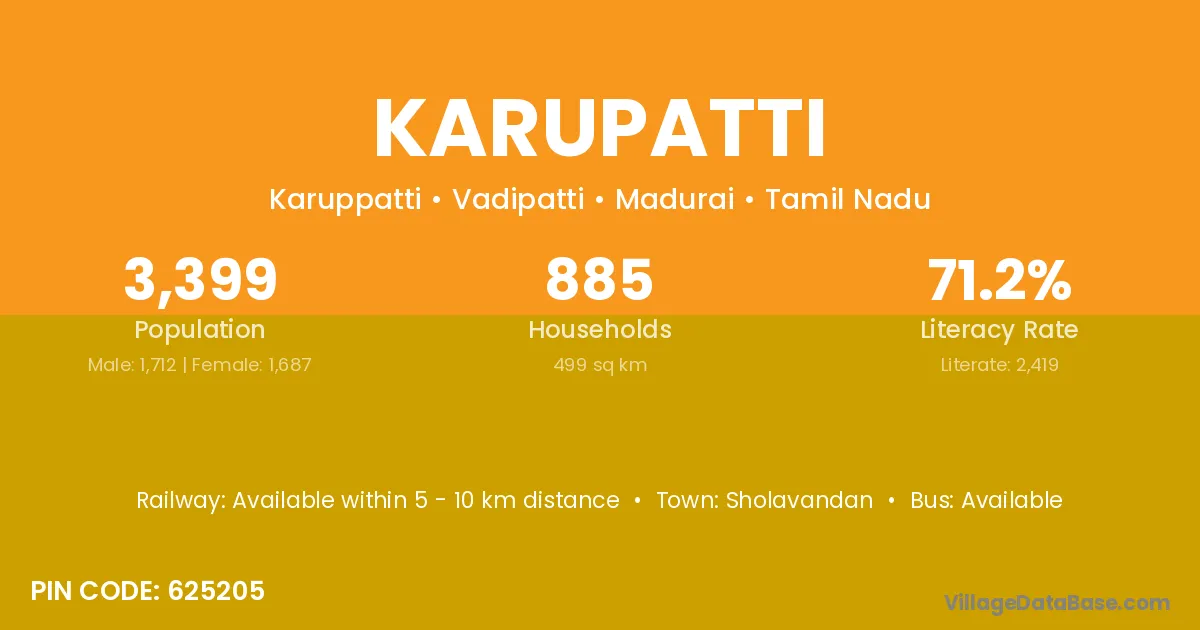 Karupatti village has a total population of 3,399 people, of which 1,712 are males and 1,687 are females.