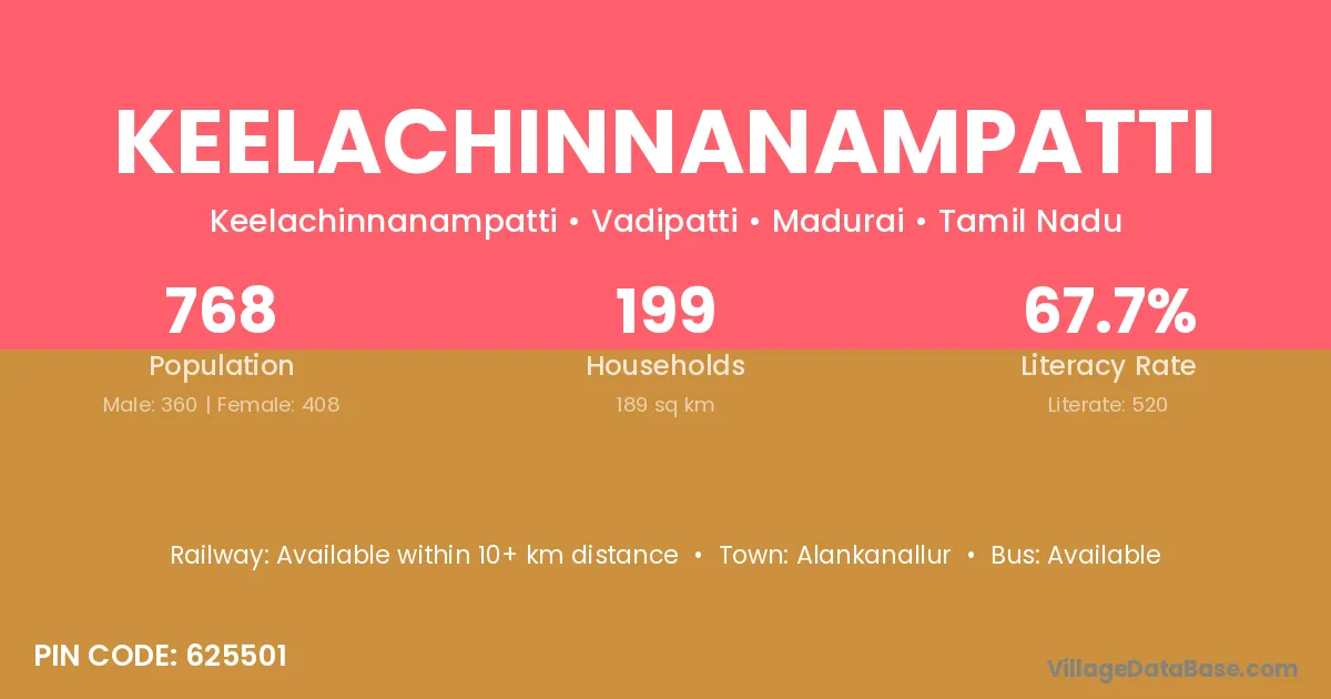 Keelachinnanampatti village has a total population of 768 people, of which 360 are males and 408 are females.