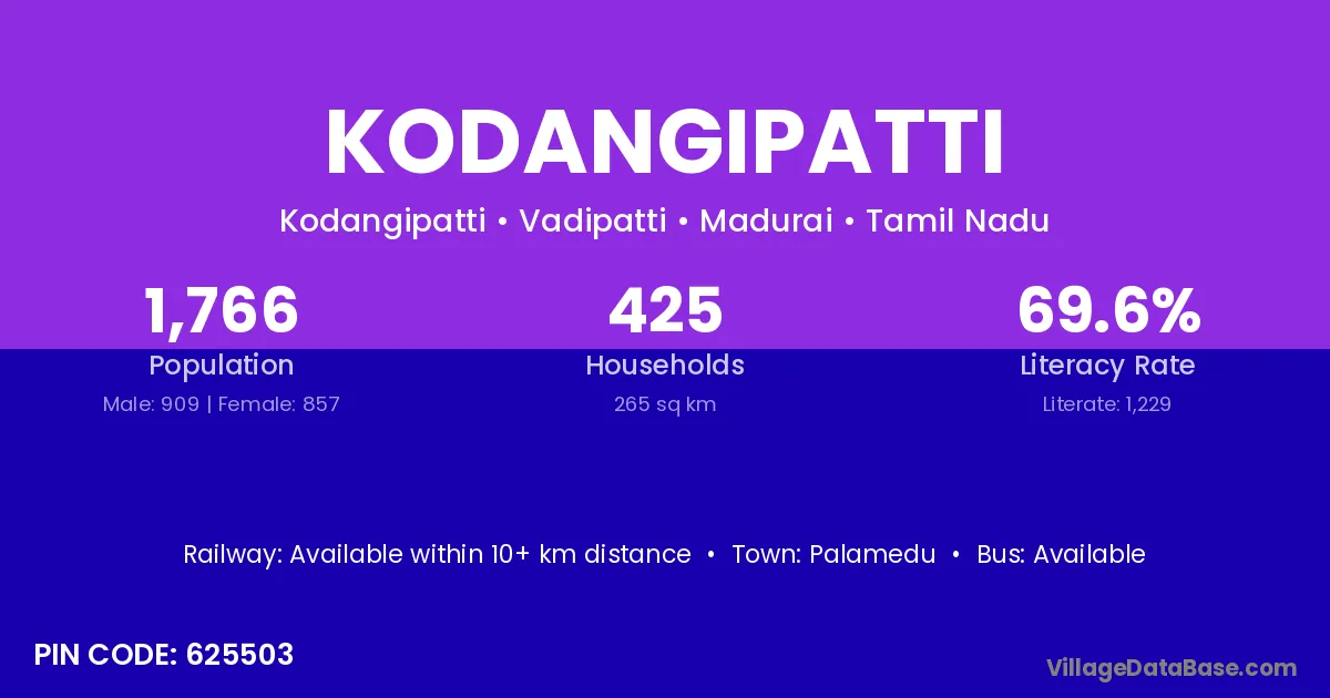 Kodangipatti village has a total population of 1,766 people, of which 909 are males and 857 are females.