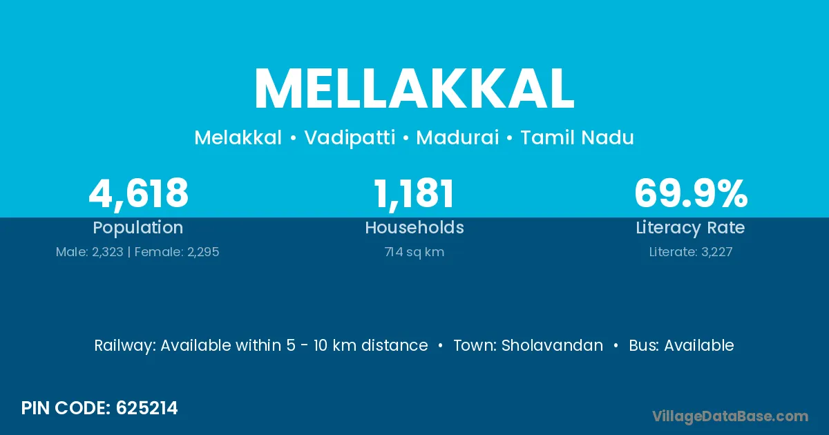 Sholavandan is the nearest town to Mellakkal village for major economic activities