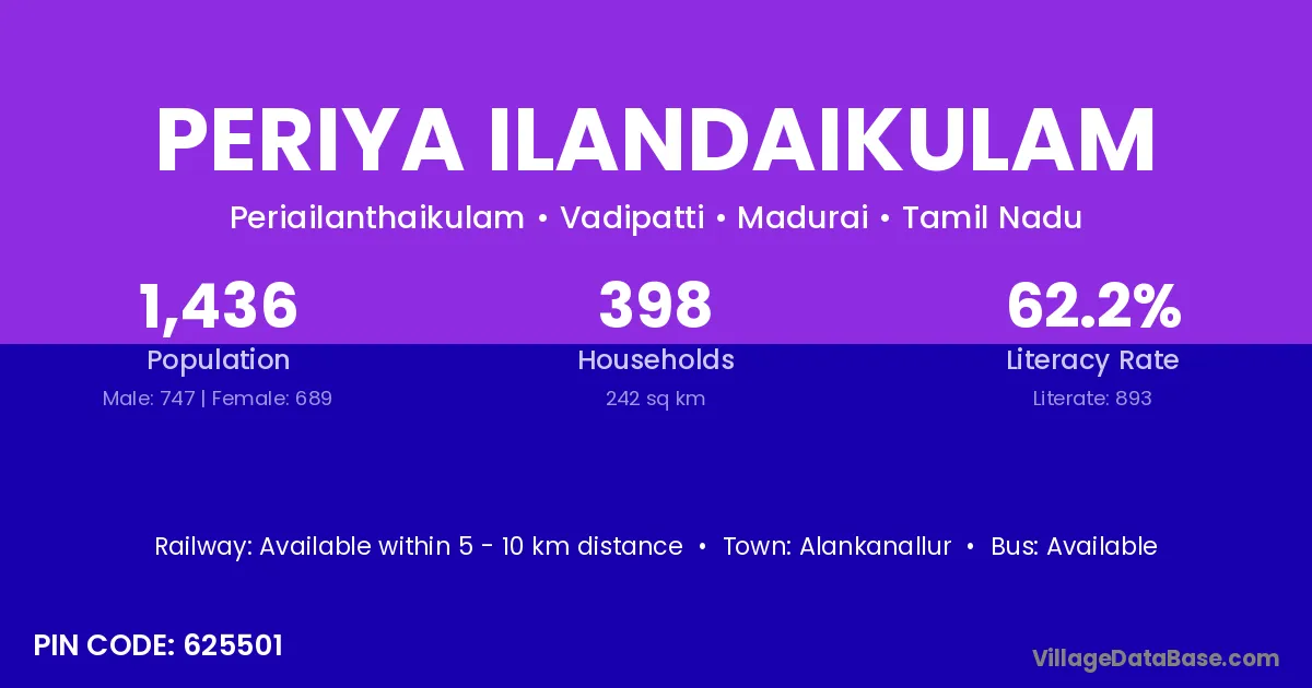 Periya Ilandaikulam village has a total population of 1,436 people, of which 747 are males and 689 are females.