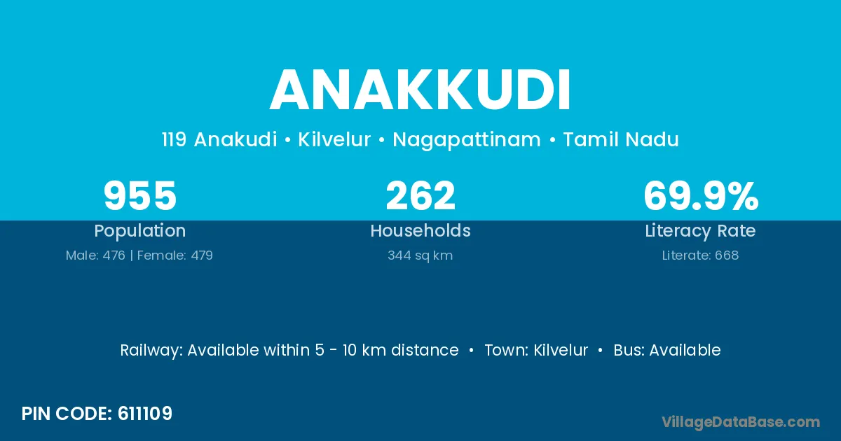 Anakkudi village has a total population of 955 people, of which 476 are males and 479 are females.