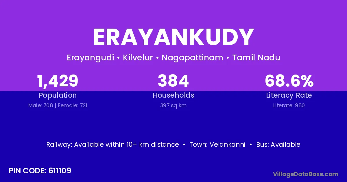 Erayankudy village has a total population of 1,429 people, of which 708 are males and 721 are females.