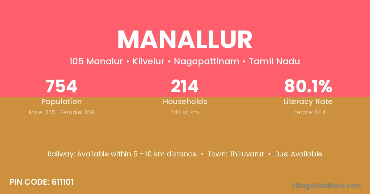 Manallur village has a total population of 754 people, of which 365 are males and 389 are females.