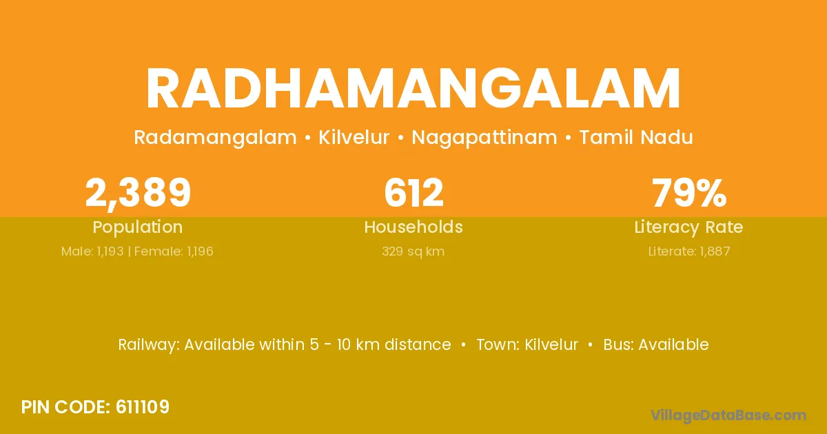 Radhamangalam village has a total population of 2,389 people, of which 1,193 are males and 1,196 are females.