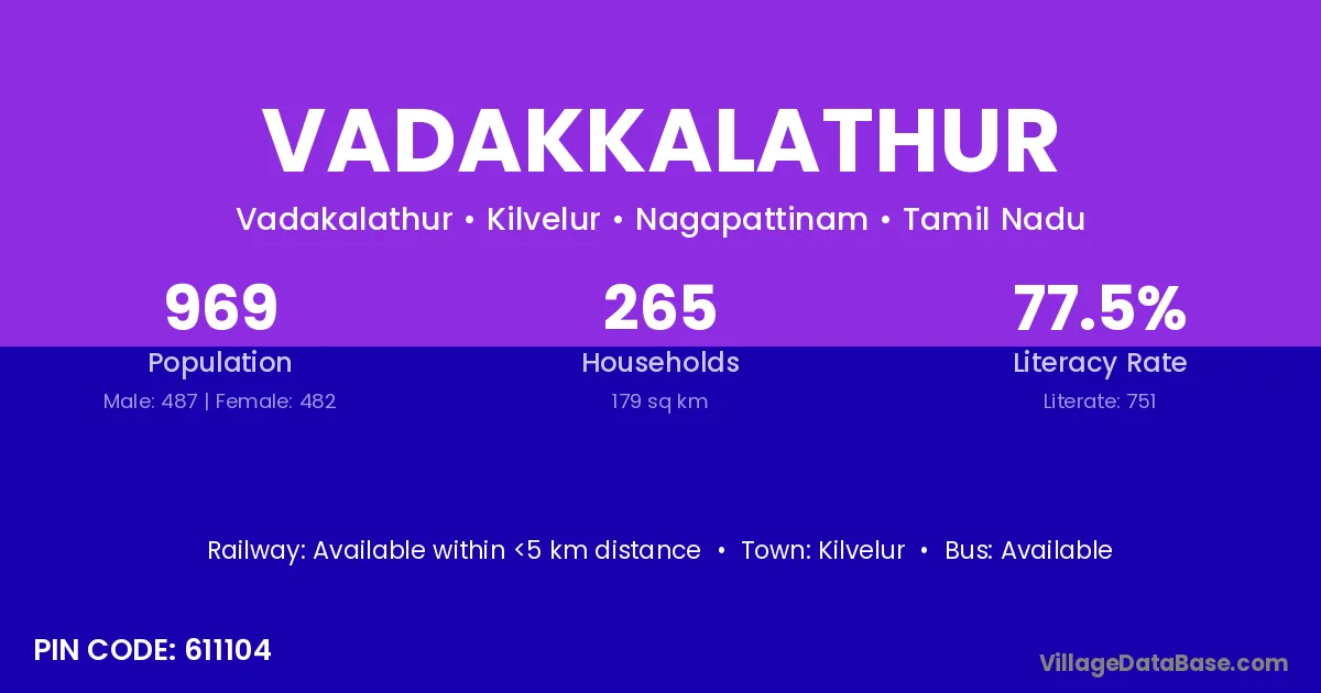 Vadakkalathur village has a total population of 969 people, of which 487 are males and 482 are females.