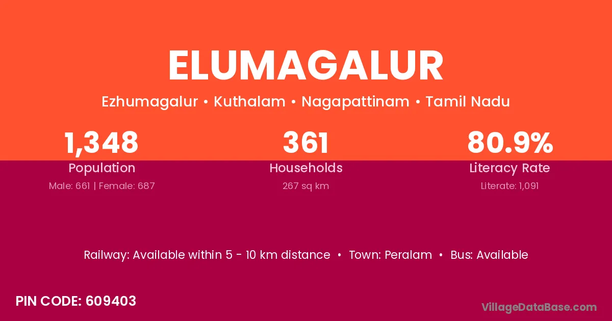 Elumagalur village has a total population of 1,348 people, of which 661 are males and 687 are females.