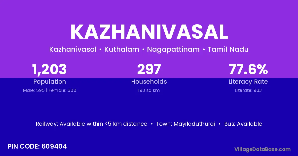 Kazhanivasal village has a total population of 1,203 people, of which 595 are males and 608 are females.