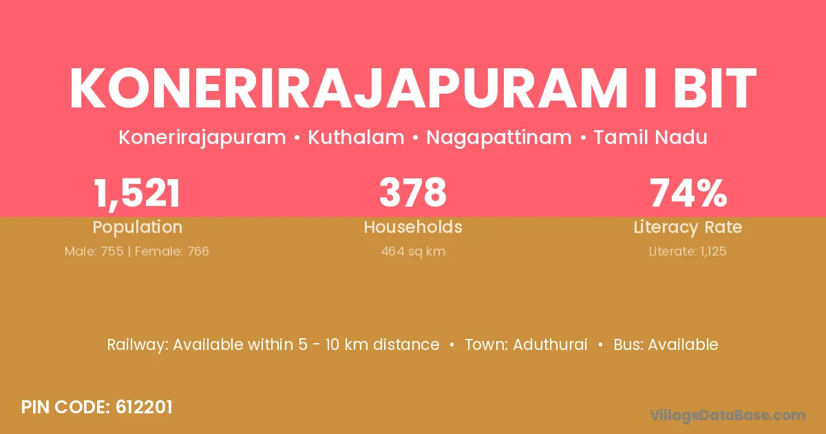 Konerirajapuram I Bit village has a total population of 1,521 people, of which 755 are males and 766 are females.