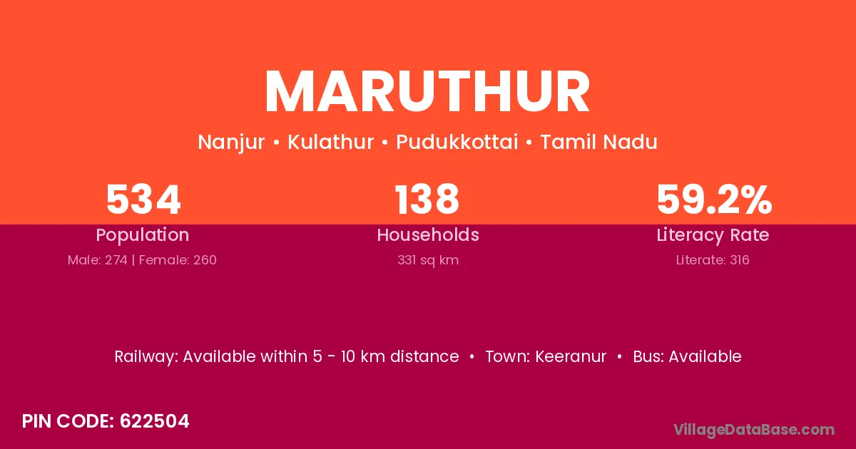 The literacy rate of Maruthur village is 74.84%. Male literacy stands at 83.77% and female literacy at 66.49%.