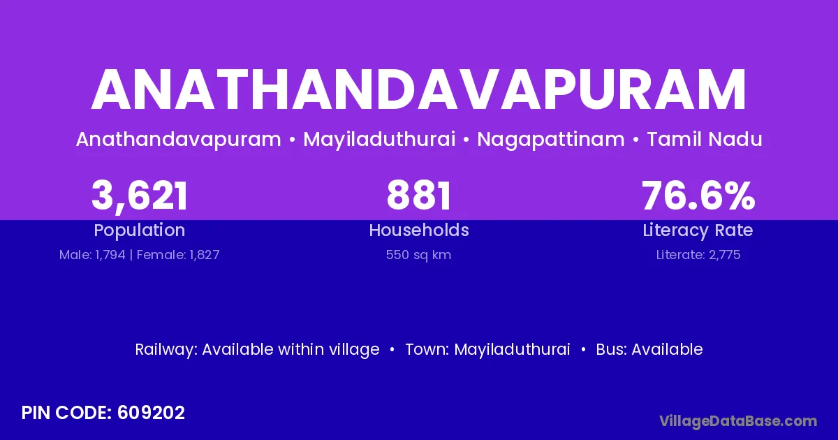 Anathandavapuram village has a total population of 3,621 people, of which 1,794 are males and 1,827 are females.