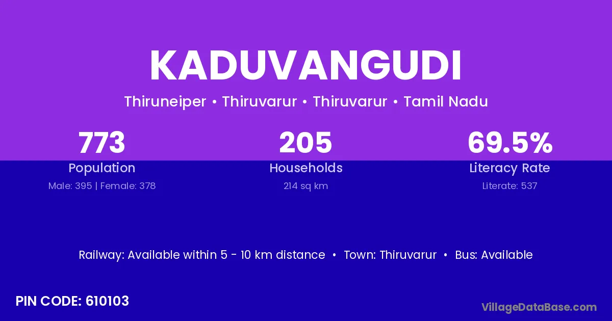 Kaduvangudi village has a total population of 1,365 people, of which 698 are males and 667 are females.