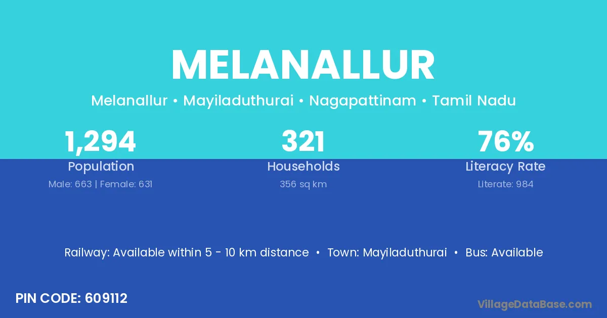 Melanallur village has a total population of 1,294 people, of which 663 are males and 631 are females.
