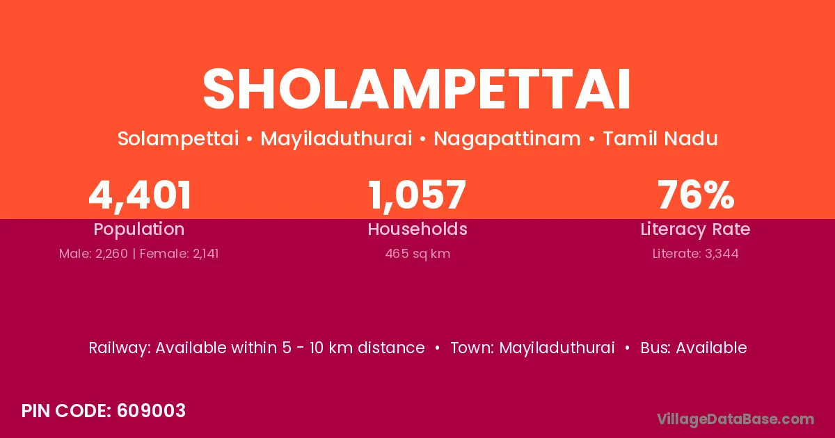 Sholampettai village has a total population of 4,401 people, of which 2,260 are males and 2,141 are females.
