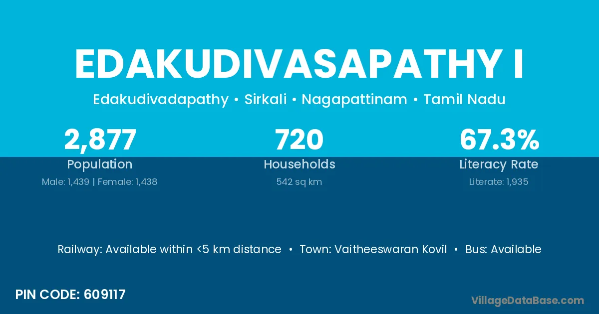 Edakudivasapathy I village has a total population of 2,877 people, of which 1,439 are males and 1,438 are females.