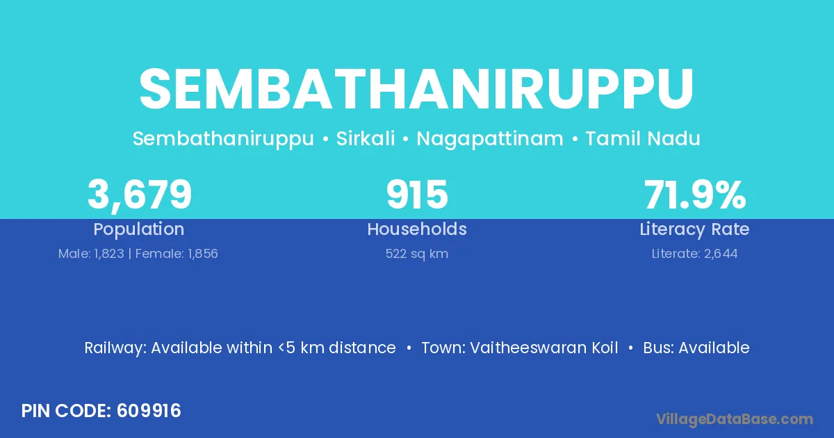 Sembathaniruppu village has a total population of 3,679 people, of which 1,823 are males and 1,856 are females.