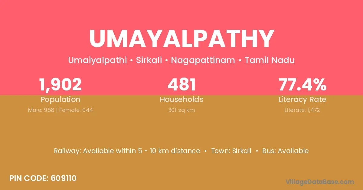 Umayalpathy village has a total population of 1,902 people, of which 958 are males and 944 are females.