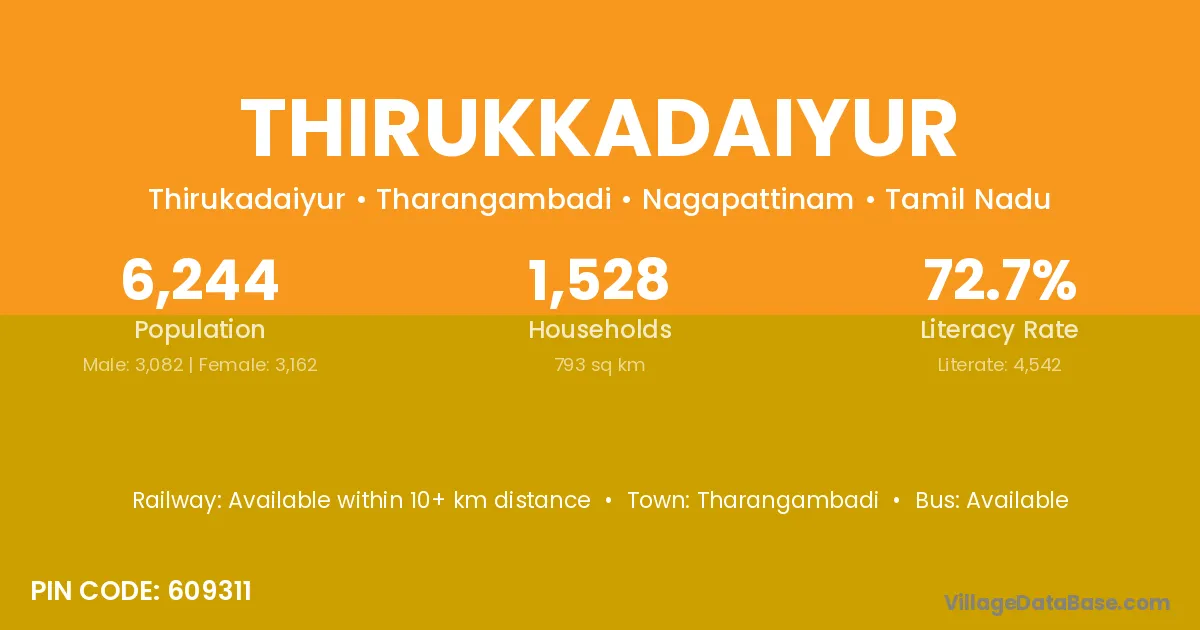 Thirukkadaiyur village has a total population of 6,244 people, of which 3,082 are males and 3,162 are females.