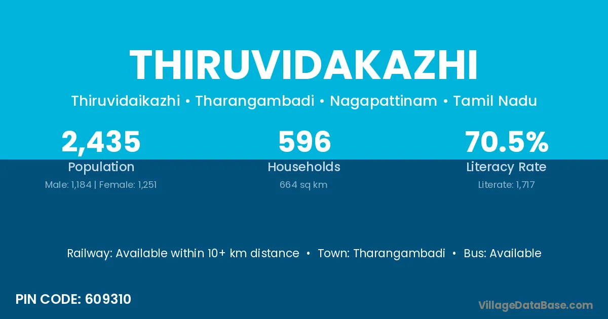 Thiruvidakazhi village has a total population of 2,435 people, of which 1,184 are males and 1,251 are females.