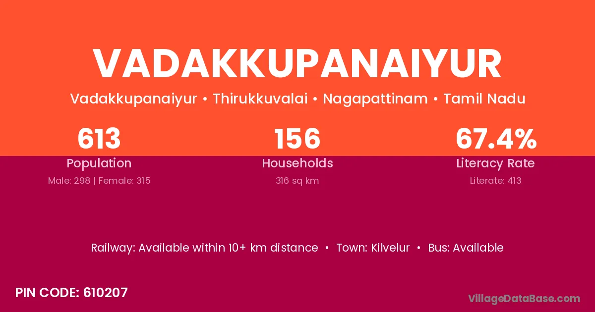 Vadakkupanaiyur village has a total population of 613 people, of which 298 are males and 315 are females.
