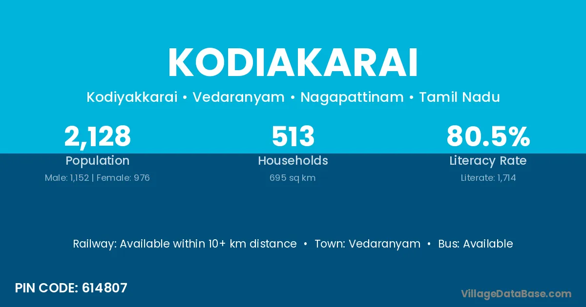 Kodiakarai village has a total population of 2,128 people, of which 1,152 are males and 976 are females.
