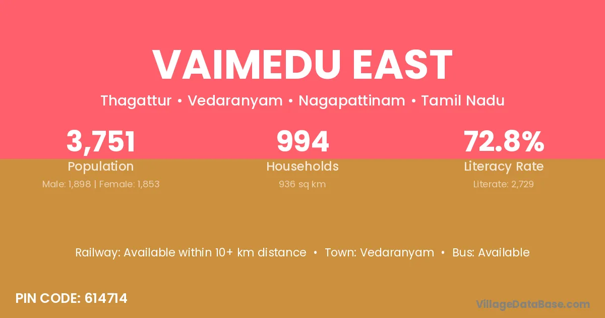 Vedaranyam is the nearest town to Vaimedu East village for major economic activities