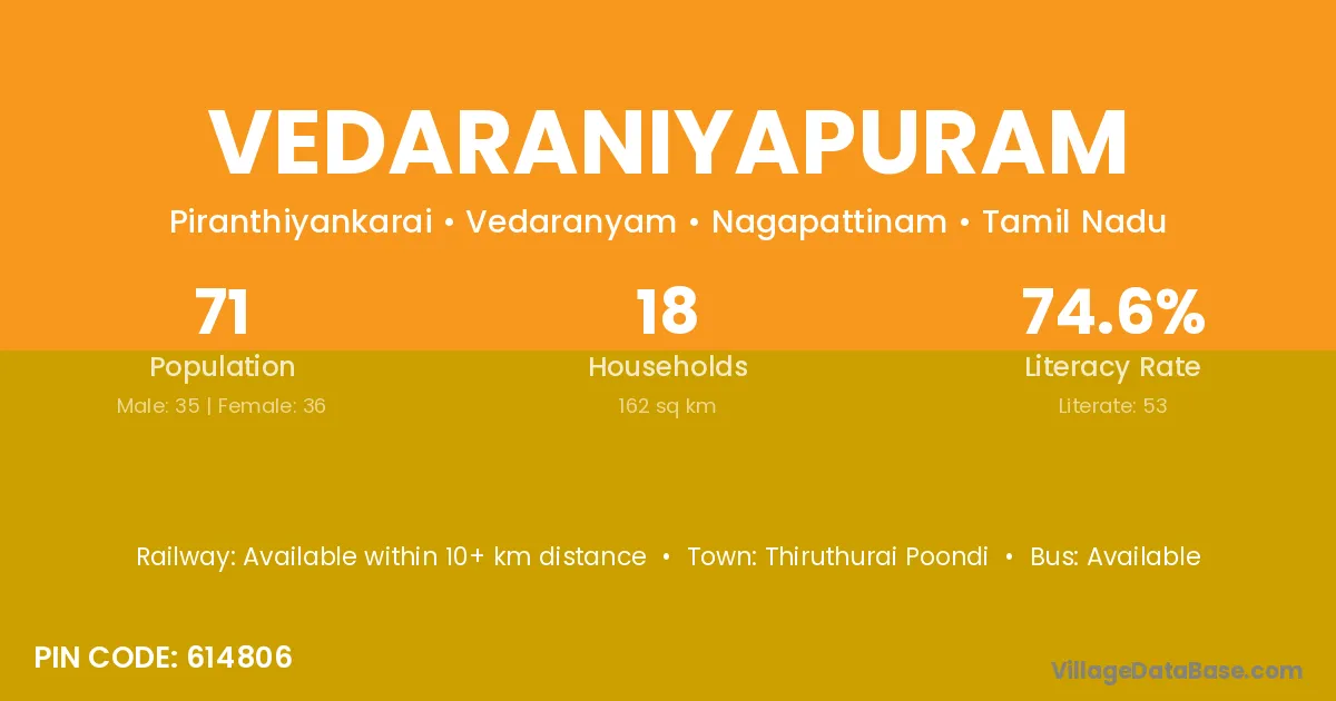 Vedaraniyapuram village has a total population of 71 people, of which 35 are males and 36 are females.