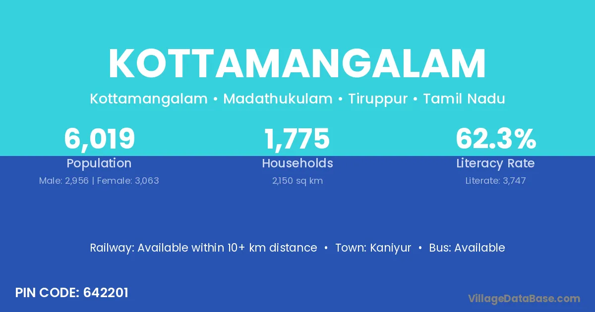 The literacy rate of Kottamangalam village is 65.71%. Male literacy stands at 75.24% and female literacy at 56.51%.