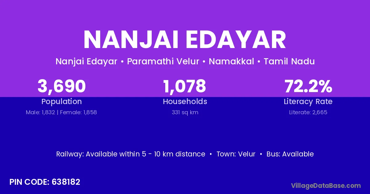 Nanjai Edayar village has a total population of 3,690 people, of which 1,832 are males and 1,858 are females.
