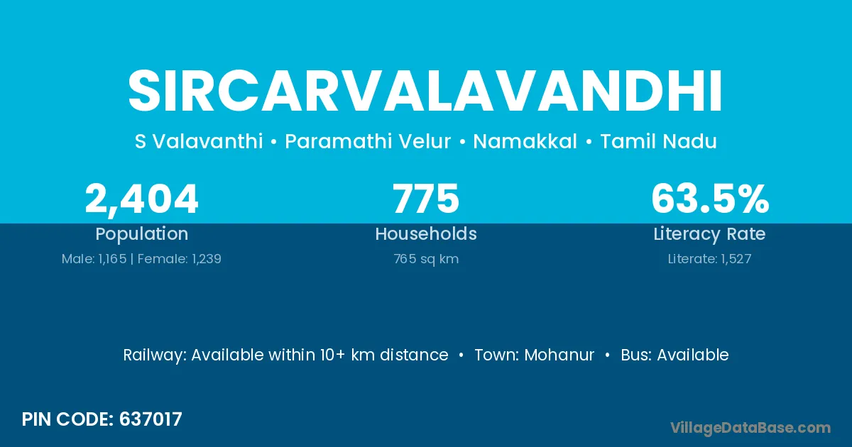 Sircarvalavandhi village has a total population of 2,404 people, of which 1,165 are males and 1,239 are females.