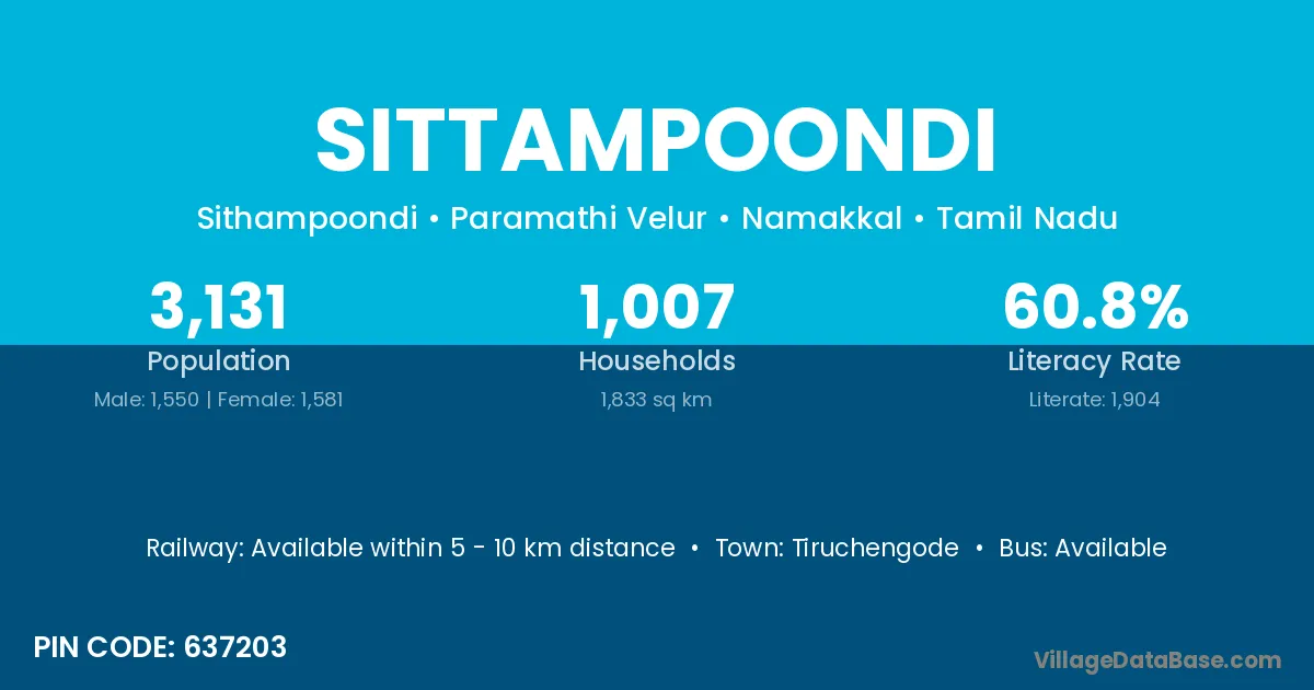 Sittampoondi village has a total population of 3,131 people, of which 1,550 are males and 1,581 are females.