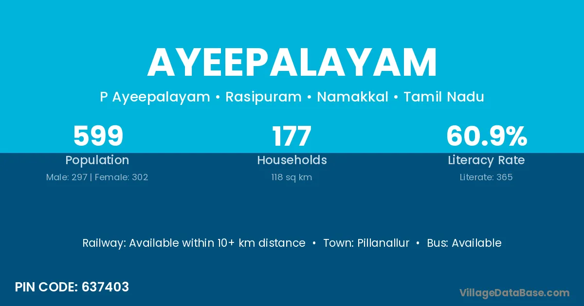 According to Census 2011 information, the village code of Ayeepalayam village is 637403.