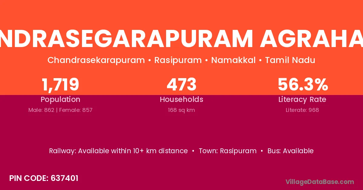 Chandrasegarapuram Agraharam village has a total population of 1,719 people, of which 862 are males and 857 are females.